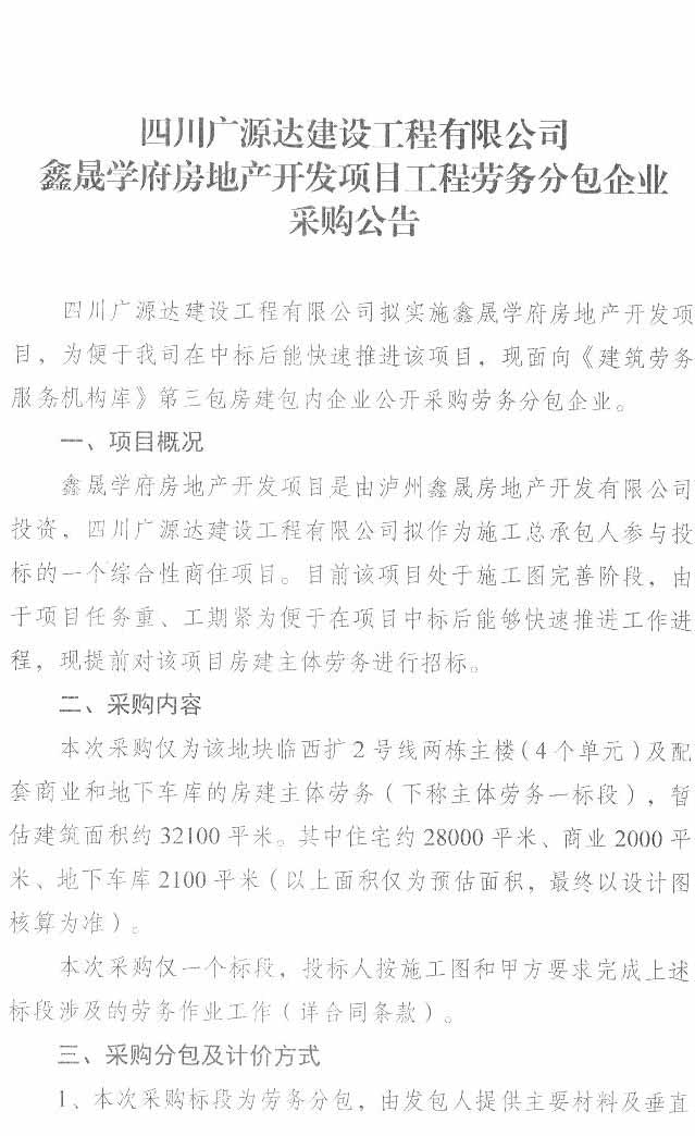 采購公告:四川廣源達(dá)建設(shè)工程有限公司鑫晟學(xué)府房地產(chǎn)開發(fā)項(xiàng)目工程勞務(wù)分包企業(yè)采購公告