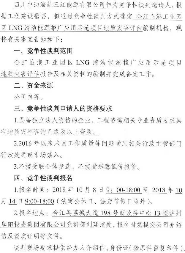 競(jìng)爭(zhēng)性談判公告:合江臨港工業(yè)園區(qū)LNG清潔能源推廣應(yīng)用示范項(xiàng)目地質(zhì)災(zāi)害評(píng)估單位競(jìng)爭(zhēng)性談判公告