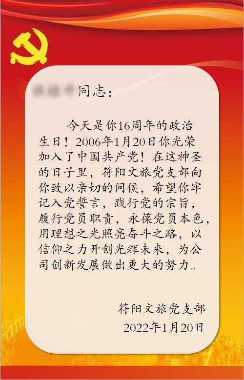 支部在核準每一名黨員入黨時間的基礎上,按照黨員入黨日期建立黨員“政治生日”臺賬,每逢黨員“政治生日”當天,黨支部將在黨員微信群發(fā)一張電子賀卡,讓黨員充分感受到組織的關懷與溫暖,從而將思想認同轉(zhuǎn)化為牢記初心、堅定信仰的前進動力,努力為公司的創(chuàng)新發(fā)展做出更大貢獻!