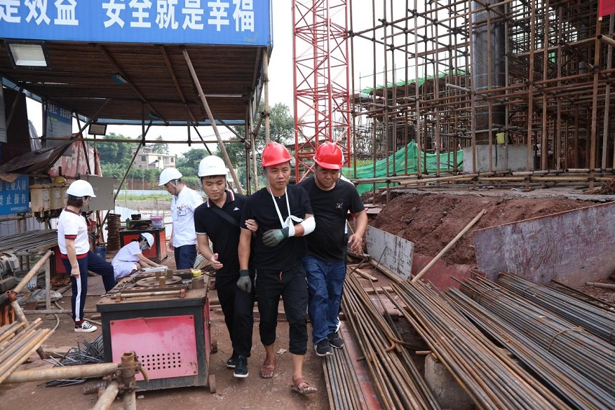 演練模擬龍掛山在建項(xiàng)目施工過程中一名鋼筋工人在鋼筋制作中手臂不慎擦劃傷,項(xiàng)目部立即進(jìn)行緊急救援。演練總體設(shè)置三項(xiàng)課時,一是現(xiàn)場傷員救助,二是應(yīng)急救援的后勤保障,三是應(yīng)急救援知識的講解。