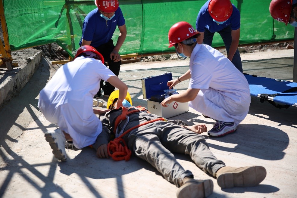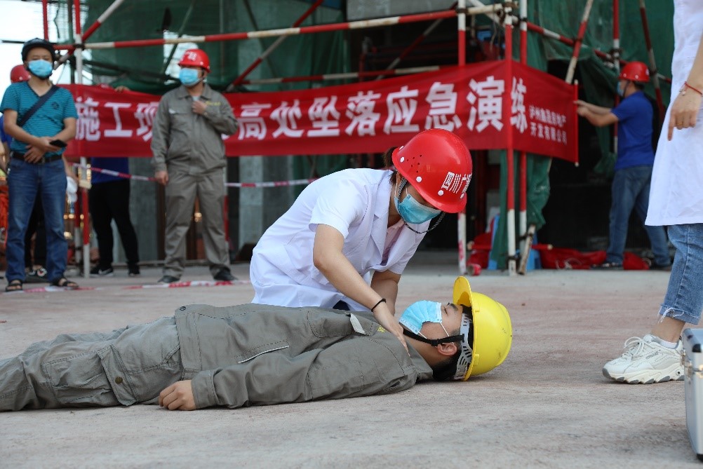 演練活動(dòng)模擬施工工人從高處墜落,項(xiàng)目部接到通報(bào)后立即啟動(dòng)應(yīng)急救援預(yù)案,“安全事故”最終得到圓滿處置。應(yīng)急救援演練后,醫(yī)護(hù)人員講解了心肺復(fù)蘇、開(kāi)放性外傷包扎等應(yīng)急救援醫(yī)護(hù)方法。