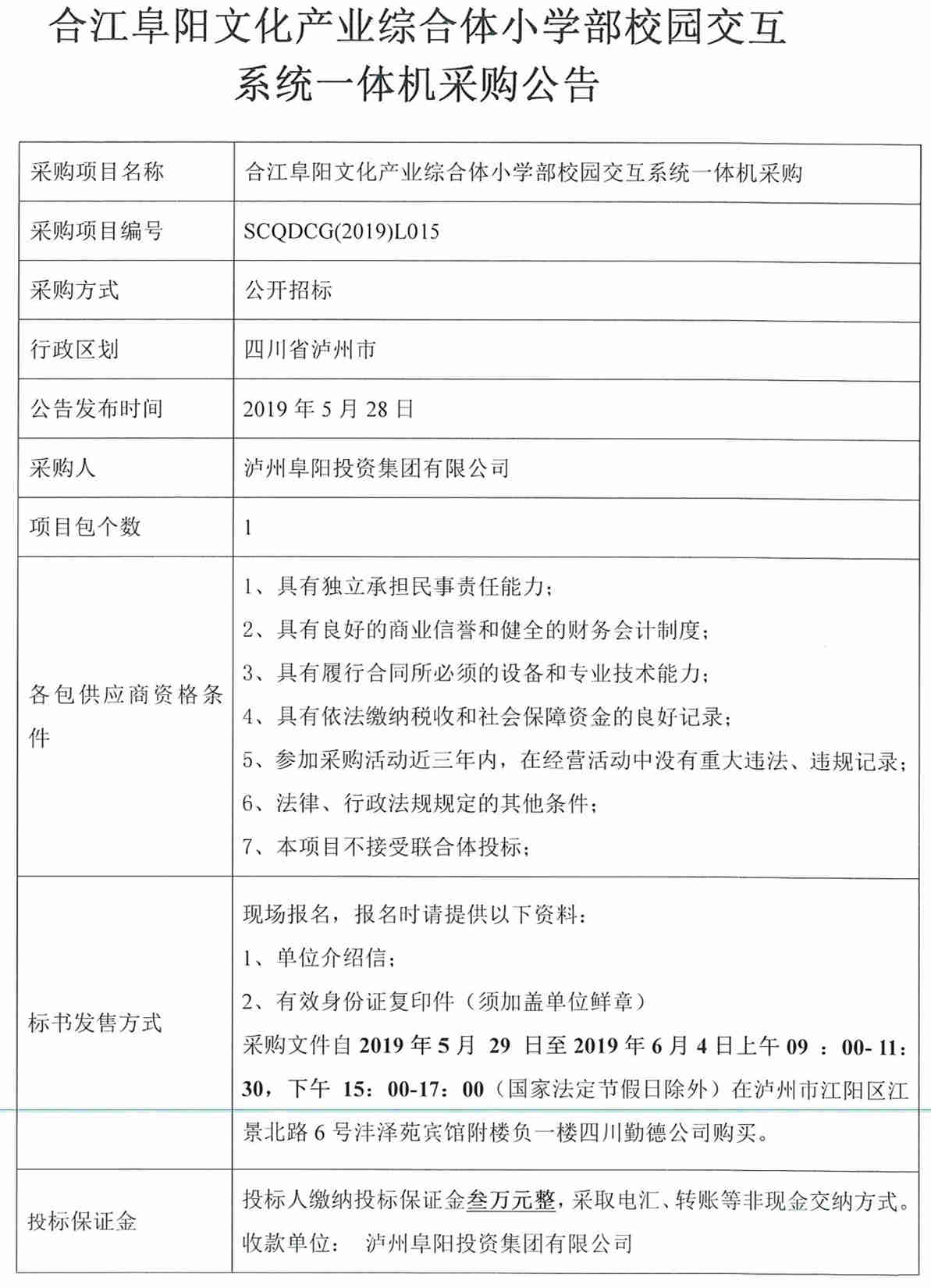 合江阜陽文化產業(yè)綜合體小學部校園交互系統(tǒng)一體機采購公告