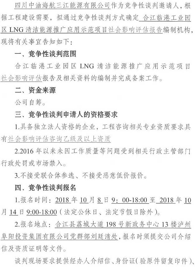 競爭性談判公告:合江臨港工業(yè)園區(qū)LNG清潔能源推廣應用示范項目社會影響評估單位競爭性談判公告