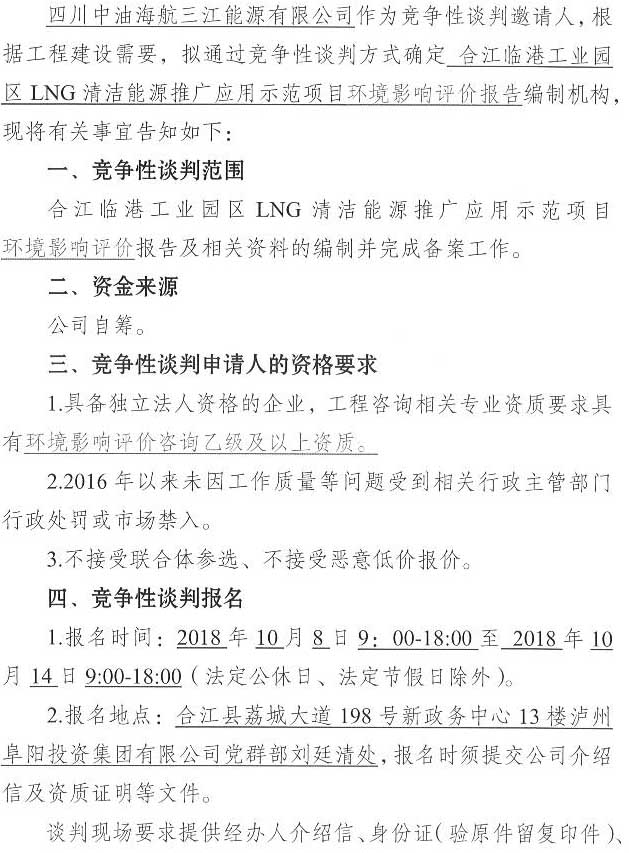 競爭性談判公告:合江臨港工業(yè)園區(qū)LNG清潔能源推廣應(yīng)用示范項(xiàng)目環(huán)境影響評(píng)價(jià)單位競爭性談判公告