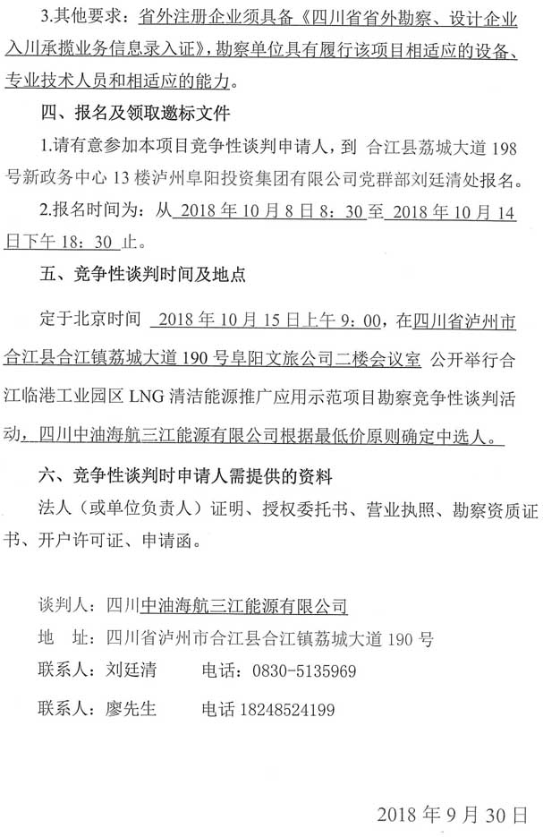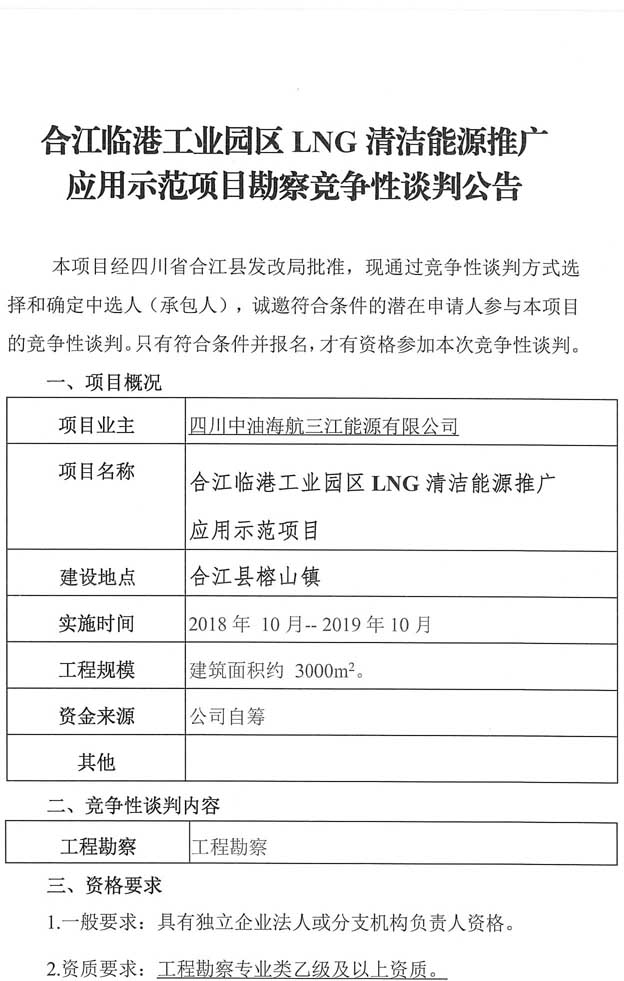競爭性談判公告:合江臨港工業(yè)園區(qū)LNG清潔能源推廣應用示范項目勘察競爭性談判公告