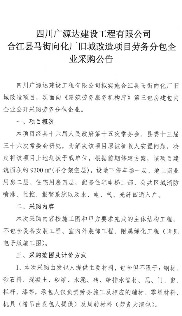 采購(gòu)公告:四川廣源達(dá)建設(shè)工程有限公司合江縣馬街向化廠舊城改造項(xiàng)目勞務(wù)分包企業(yè)采購(gòu)公告