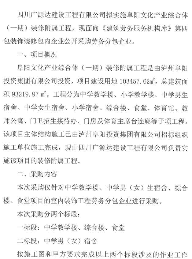 采購(gòu)公告:四川廣源達(dá)建設(shè)工程有限公司阜陽(yáng)文化產(chǎn)業(yè)綜合體(一期)裝修附屬工程勞務(wù)分包企業(yè)采購(gòu)公告