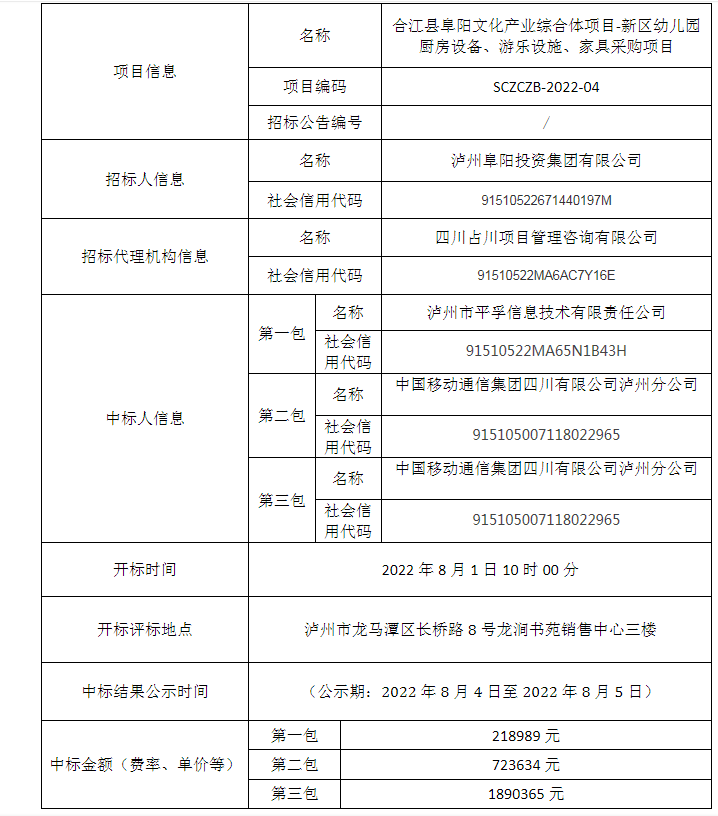 合江縣阜陽文化產業(yè)綜合體項目-新區(qū)幼兒園廚房設備、游樂設施、家具采購項目公開招標中標結果公告